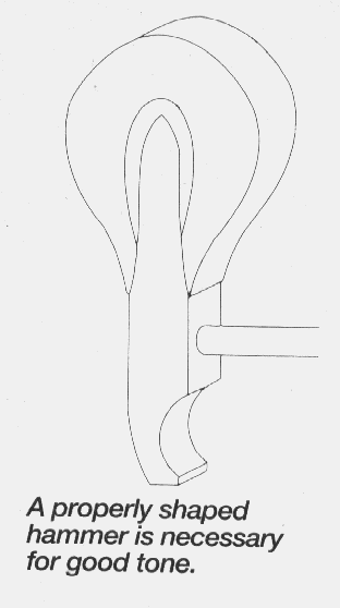 For a tone that is too weak or too mellow, hardening of the hammer felt may be necessary. This is usually done by filing away soft outer layers of hammer felt or by applying a chemical hardening solution.